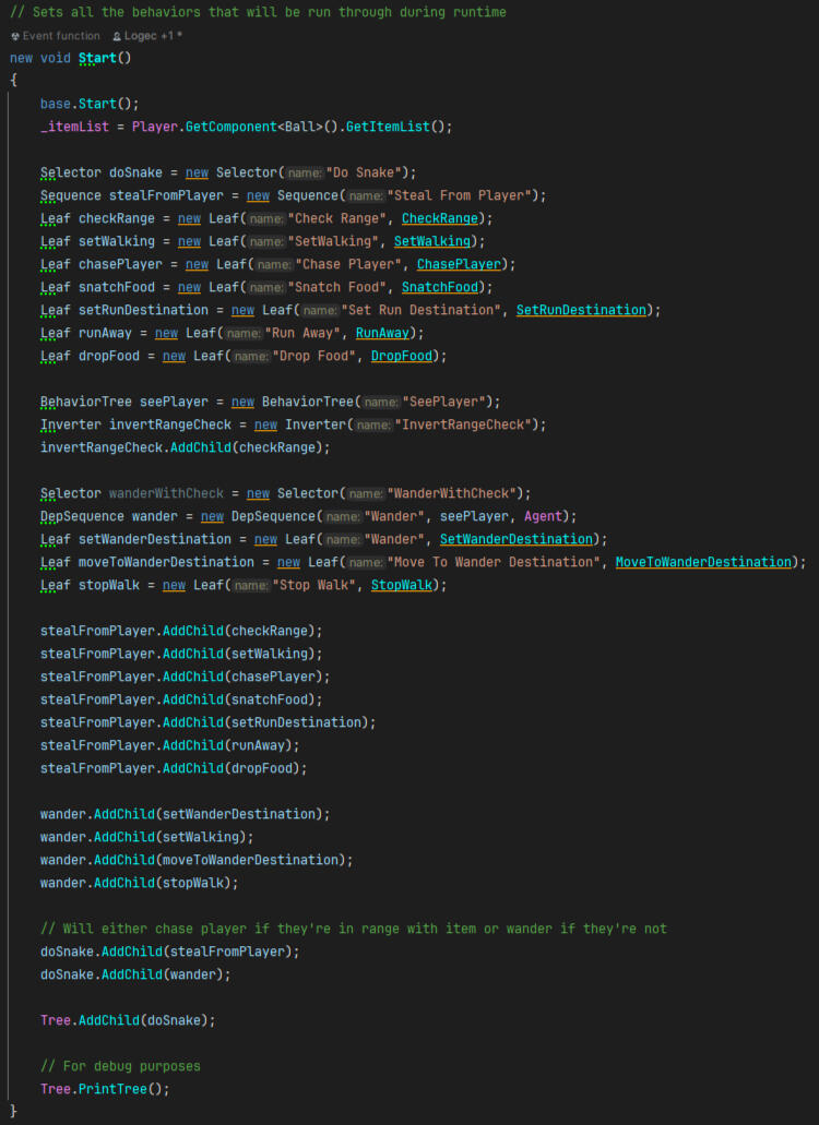 I had worked on a number of different types of AI that could have been used in the game. In order to make them work, I had used the behavior tree model, which I got from the Holistic 3D behavior tree course. In the end, only one of them made it to the final product due to lack of art assets that could have been used for them.Of the ones that couldn't make it, one was meant to be a food item that would run away from the player if they got close. The second one was meant to be an animal that would move the items on the stage around. The last one of them was meant to be some sort of guard dog that would chase the player if they entered a certain area that they guarded.