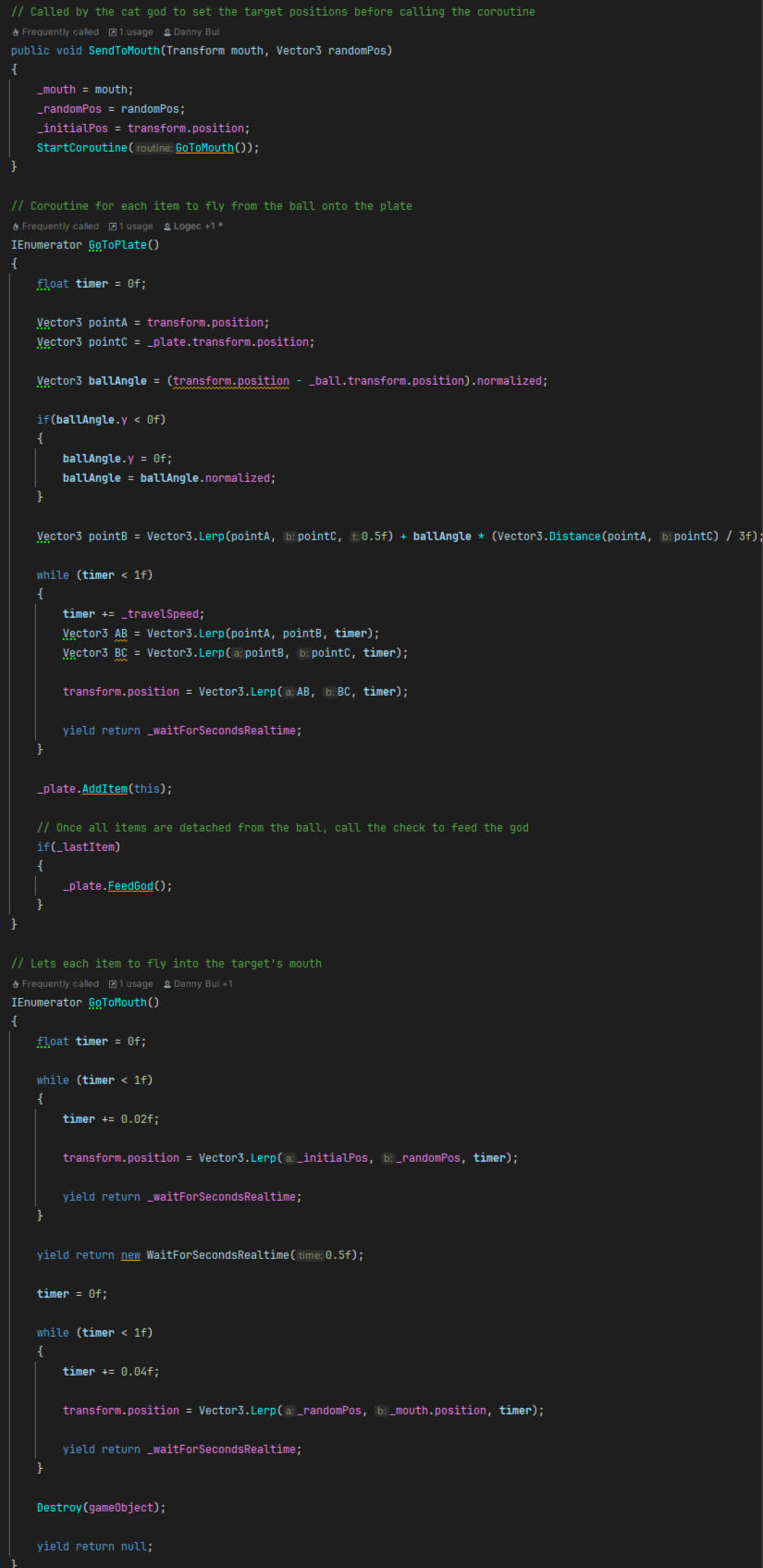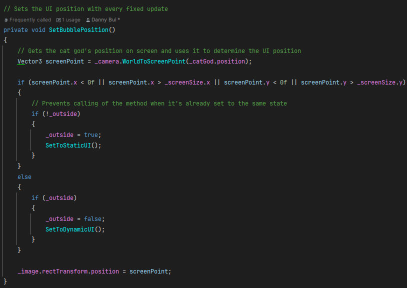 The UI was made to change depending on whether or not the cat god was on screen. It would be static with fixed positions while it was off screen, while being dynamic and following the cat god if it was off screen. It was also directly tied to the item system, where it would change immediately as the food items are delivered onto the god's plate.