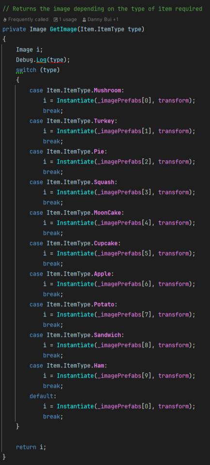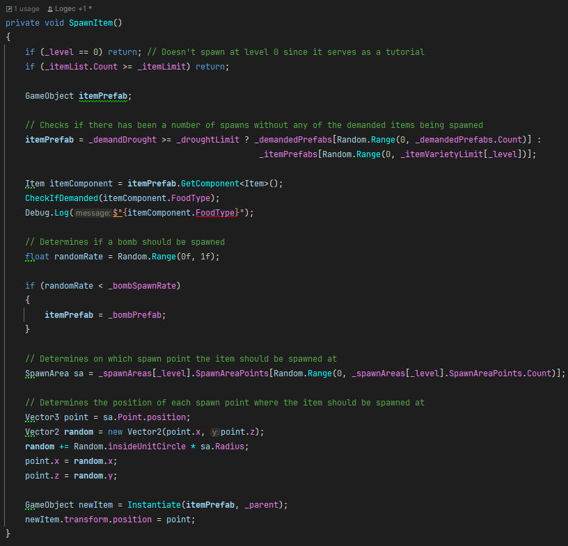 The item system was a big part of the game, as it was required in order for a lot of the other components to function. The items needed to be spawned at certain intervals, while also making sure that the game wouldn't go too long without spawning the item that the player needs to complete their objective, which very well could happen.There were several different item types, so they all needed to be accounted for as well. We needed to make sure that new types of items would get unlocked as the player progressed through the game.All of this would also get tied to the UI, so that the player can keep track of their current objective. The game will randomly choose the item types and the amount of each type to demand from the player and show it on screen.