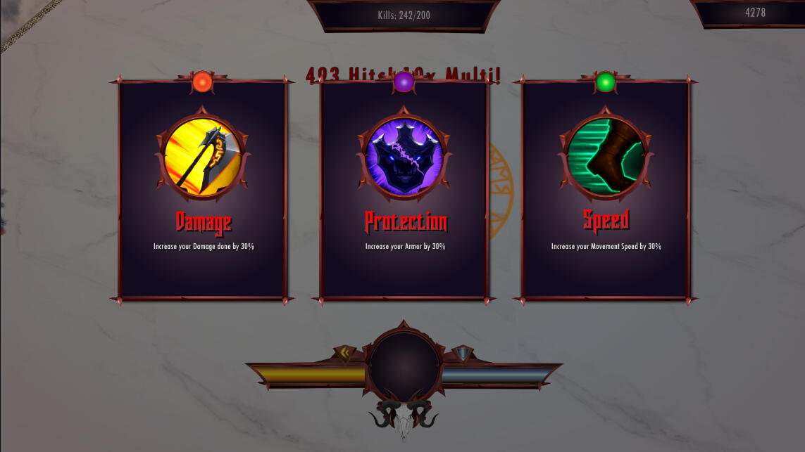 While I wasn't responsible for making the upgrade system for the game, I took it upon myself to create the upgrade screen for when the player finishes a level. The screen would fade slightly and then pop in a set of three cards that the player can choose from. Once selected, the upgrade UI would disappear and the player can proceed to the next level.There were supposed to be more upgrades to choose from to add some form variety between each playthrough, while randomizing which cards would be displayed on the screen. In the end, we only had three upgrades to choose from, so there's not much of a variety in the final product.